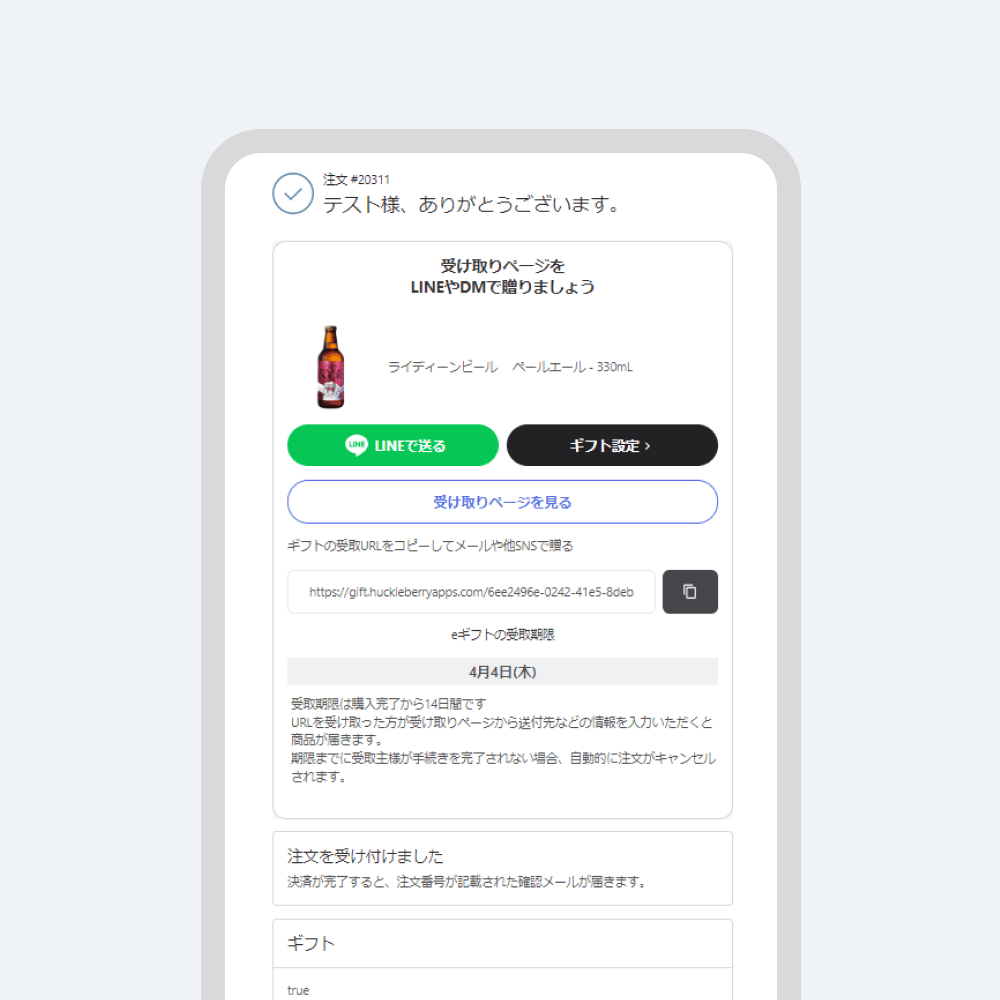 受け取りページのURLをコピーし、LINEやメールで送り先に共有してください。
