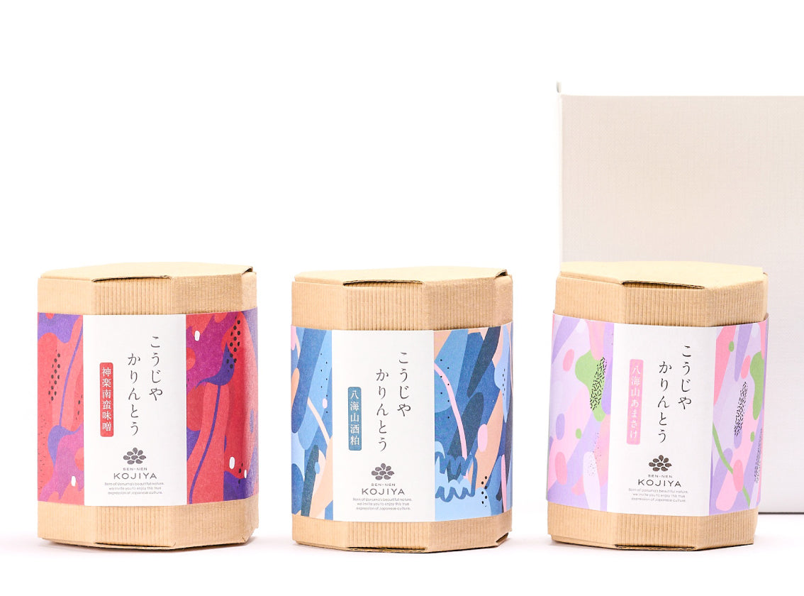 こだわりの「こうじや かりんとう」3種をセットにいたしました。”酒粕かりんとう”は、八海山の酒粕を贅沢に使い、豊かな酒粕の風味がふんわりと香る一品。”あまさけかりんとう”は、自然な甘さのあまさけを練り込み、しっとりとした食感とともに、優しい甘さが口いっぱいに広がります。そして”神楽南蛮味噌かりんとう”は、辛味とコクが特徴の深い味わいが、後を引く美味しさを提供します。 ちょっとした贈り物にも、自分用にも最適な商品です。