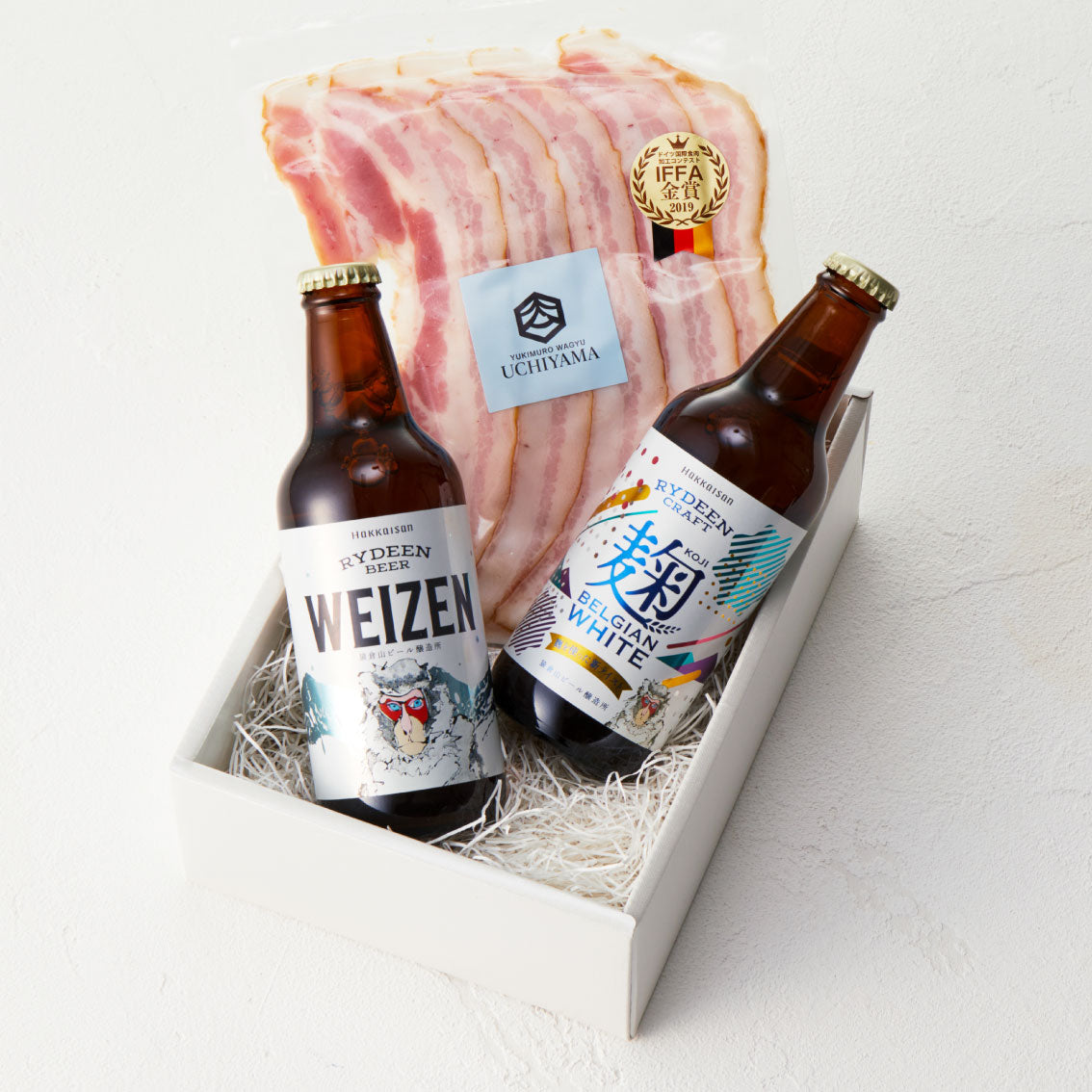 内山肉店 あまさけベーコンスライス 雪ひかりポーク×1、ライディーンビール ヴァイツェン×1、麹ベルジャンホワイト×1