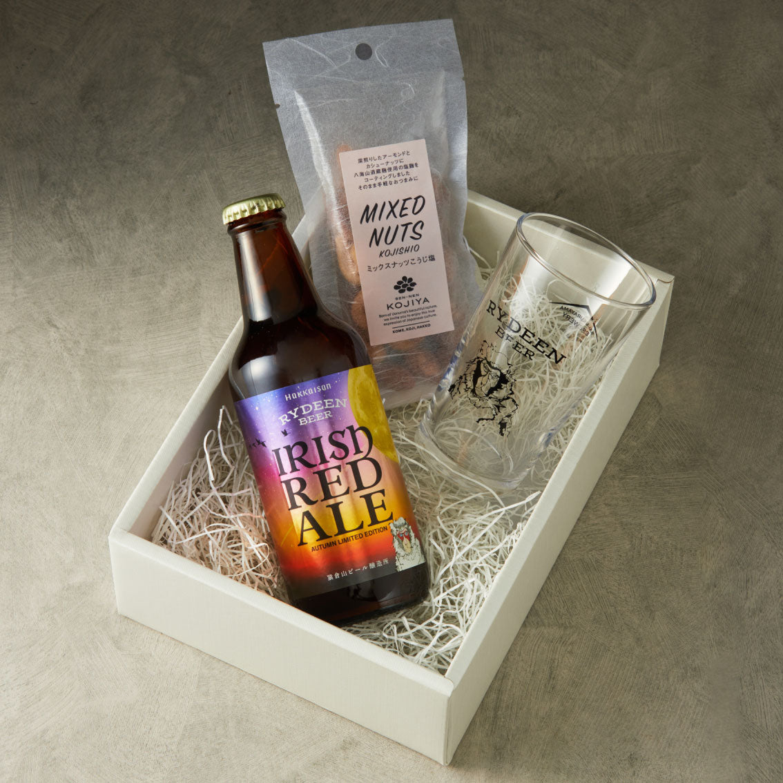 アイリッシュレッドエール×1、ミックスナッツこうじ塩×1、ライディーンビールグラス×1
