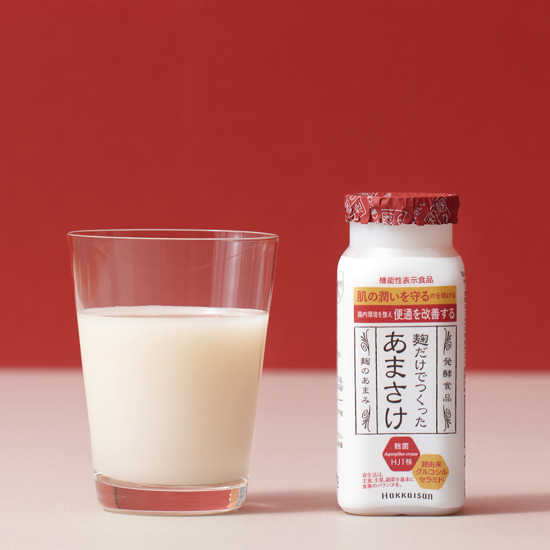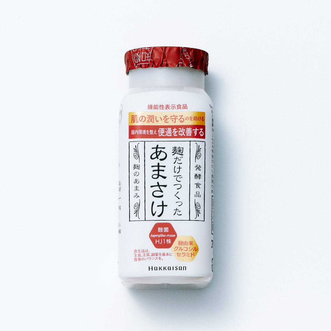「麹だけでつくったあまさけ」:本品には麹菌Aspergillus oryzae HJ1 株と麹由来グルコシルセラミドが含まれます。麹菌 Aspergillus oryzae HJ1 株には腸内環境を整え、便通を改善する機能があります。麹由来グルコシルセラミドは肌の潤いを守るのを助ける機能があります。1日118g(小ボトル1 本分)を目安にお召し上がりください。[届出番号:I290]