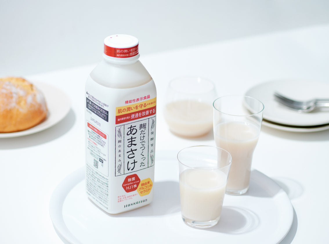 「麹だけでつくったあまさけ」:本品には麹菌Aspergillus oryzae HJ1 株と麹由来グルコシルセラミドが含まれます。麹菌 Aspergillus oryzae HJ1 株には腸内環境を整え、便通を改善する機能があります。麹由来グルコシルセラミドは肌の潤いを守るのを助ける機能があります。1日118g(小ボトル1 本分)を目安にお召し上がりください。[届出番号:I290]