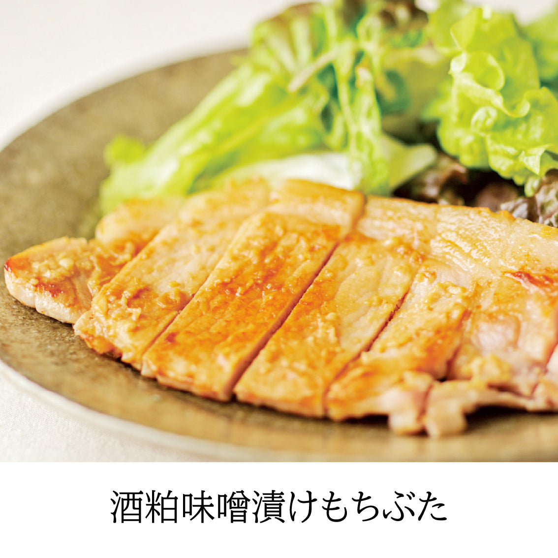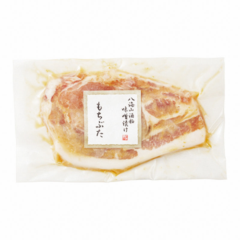八海山の酒粕味噌使用し、じっくりと漬け込みました。「もちぶた」という名は、つきたてのお餅のような弾力と、歯切れの良い柔らかさから名付けられました。キメの細かい柔らかさと、さっぱりとした後味が特徴の商品です。